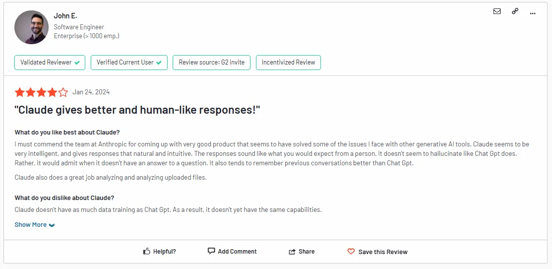 ‘’I must commend the team at Anthropic for coming up with a very good product that seems to have solved some of the issues I face with other generative AI tools. Claude seems to be very intelligent and gives responses that are natural and intuitive. The responses sound like what you would expect from a person. It doesn’t seem to hallucinate like ChatGPT does’’. – G2 Review.