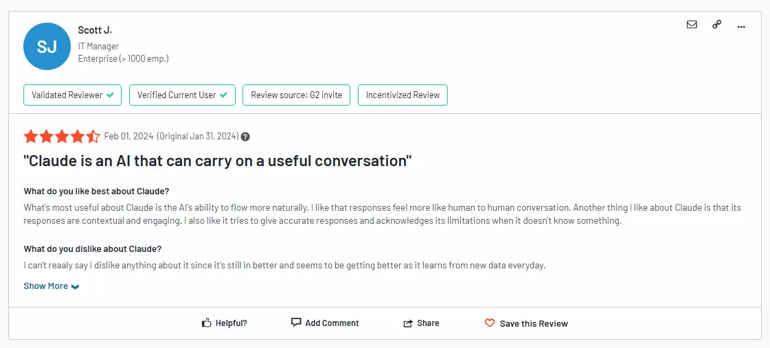 ‘’What’s most useful about Claude is the AI’s ability to flow more naturally. I like that responses feel more like human-to-human conversation. Another thing I like about Claude is that its responses are contextual and engaging. I also like it tries to give accurate responses and acknowledges its limitations when it doesn’t know something.’’ – G2 Review.