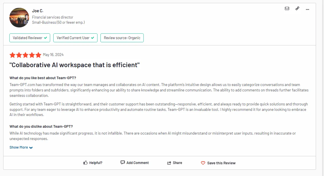 Team-GPT.com has transformed the way our team manages and collaborates on AI content. The platform’s intuitive design allows us to easily categorize conversations and team prompts into folders and subfolders, significantly enhancing our ability to share knowledge and streamline communication. The ability to add comments on threads further facilitates seamless collaboration. – G2 Review.