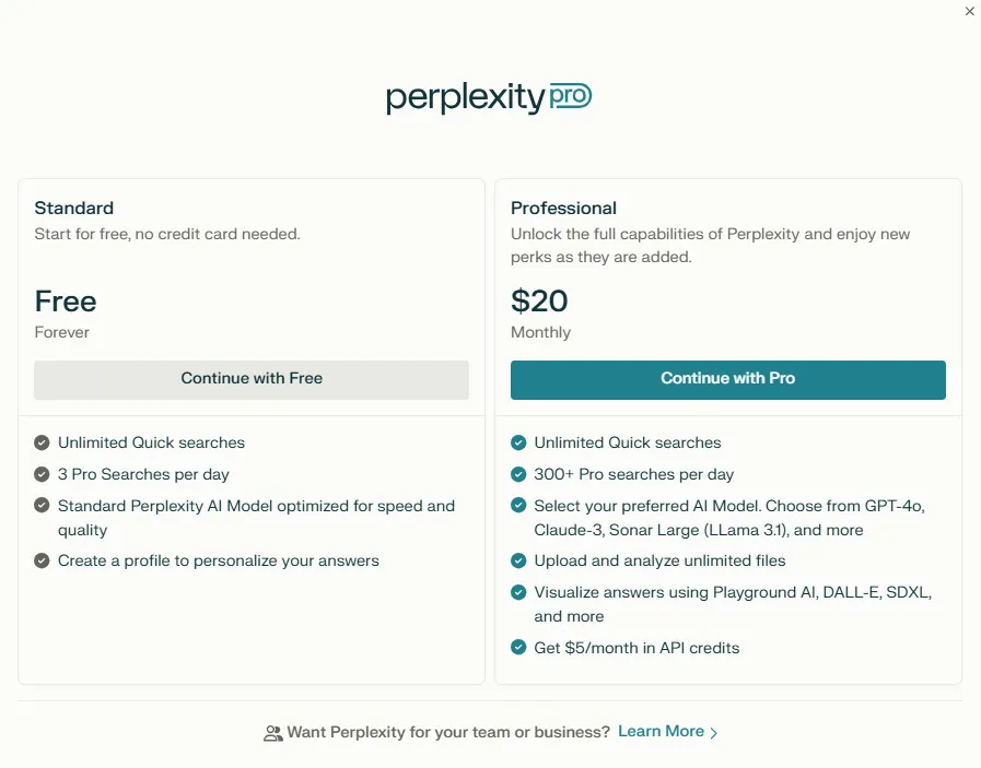 Perplexity’s pricing offers a freemium plan that offers unlimited quick searches and up to 5 Pro searches per day.