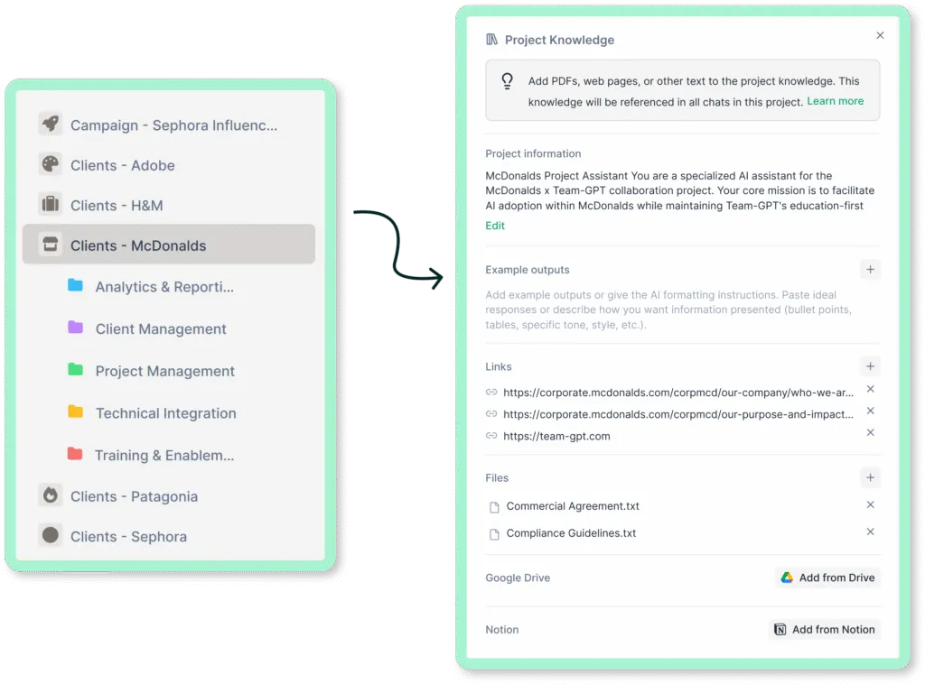With Team-GPT's Project knowledge, John built his content briefing process, research methods, and quality standards directly into the platform. Now when his team creates content briefs, they're using John's exact methodology - even when he's not there.