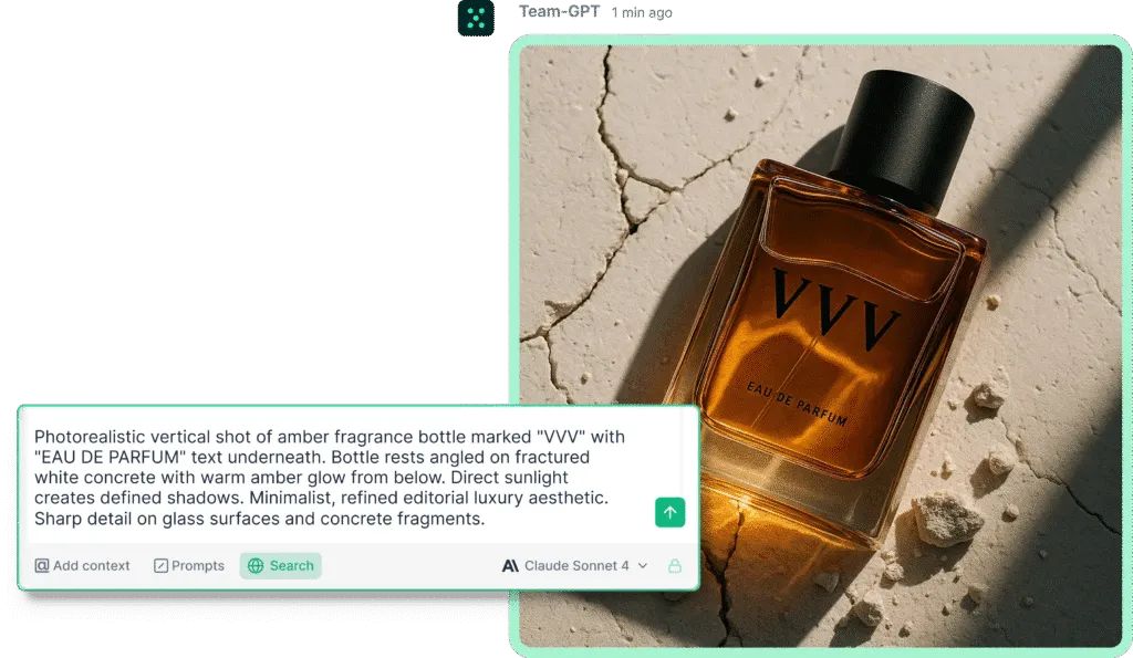 Your team can refine prompts together, building on each other's ideas until you get exactly what you need. Start with a basic concept, then let teammates add details about composition, lighting, and style.