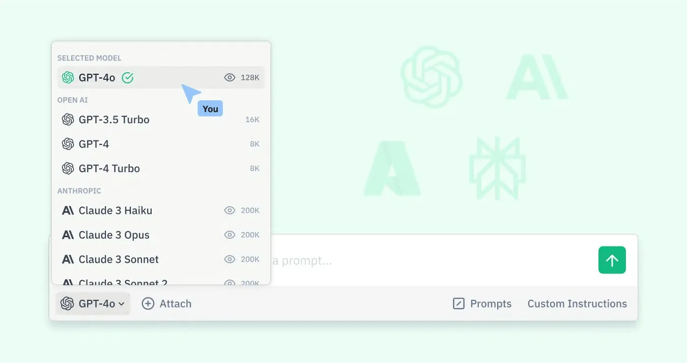 - Model Flexibility in the Same Workspace: Your team isn’t stuck with just one model. You can use GPT-4, Claude, Gemini, or open-source models like Mistral and LLaMa, all in the same workspace. Each team member can choose the right model for their task and compare results side-by-side.