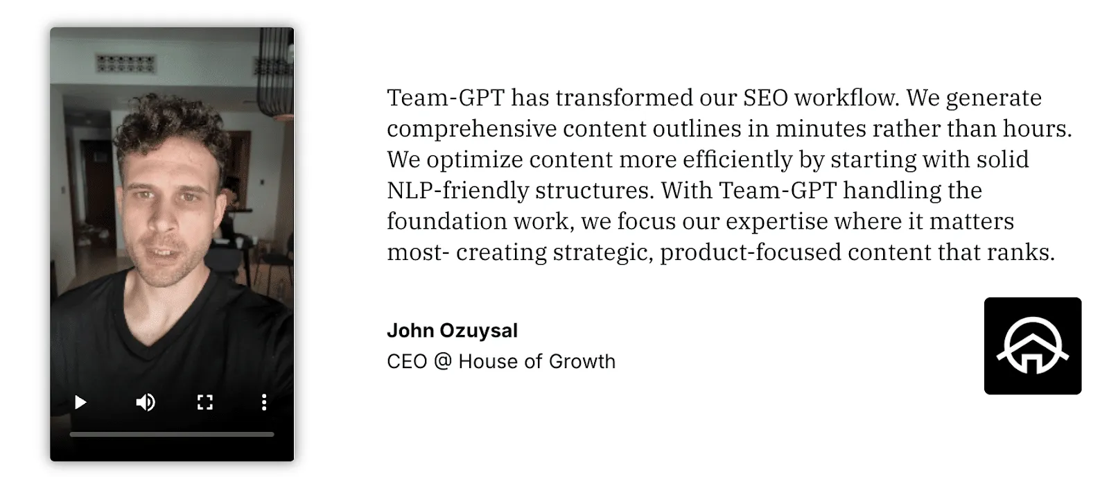 For example, House of Growth, an SEO agency, scaled from 80 to 160 articles per month using Team-GPT’s AI workflows. With automated content outlines and NLP-friendly writing, they saved 85+ hours every month without increasing headcount. Their team now focuses on strategy, not formatting or research.