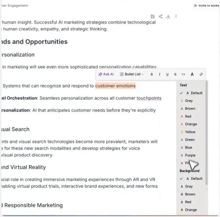 - Rich formatting built-in: Just like a traditional doc editor, you can structure content with headings, bullet points, numbered lists, and styled text, so marketing materials are polished and presentation-ready from the start.