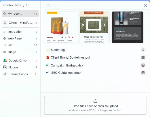 - Keep all your marketing assets in one place: Upload brand guidelines, campaign briefs, customer personas, competitor research, and more. The AI uses this context automatically to generate content that matches your voice and strategy.