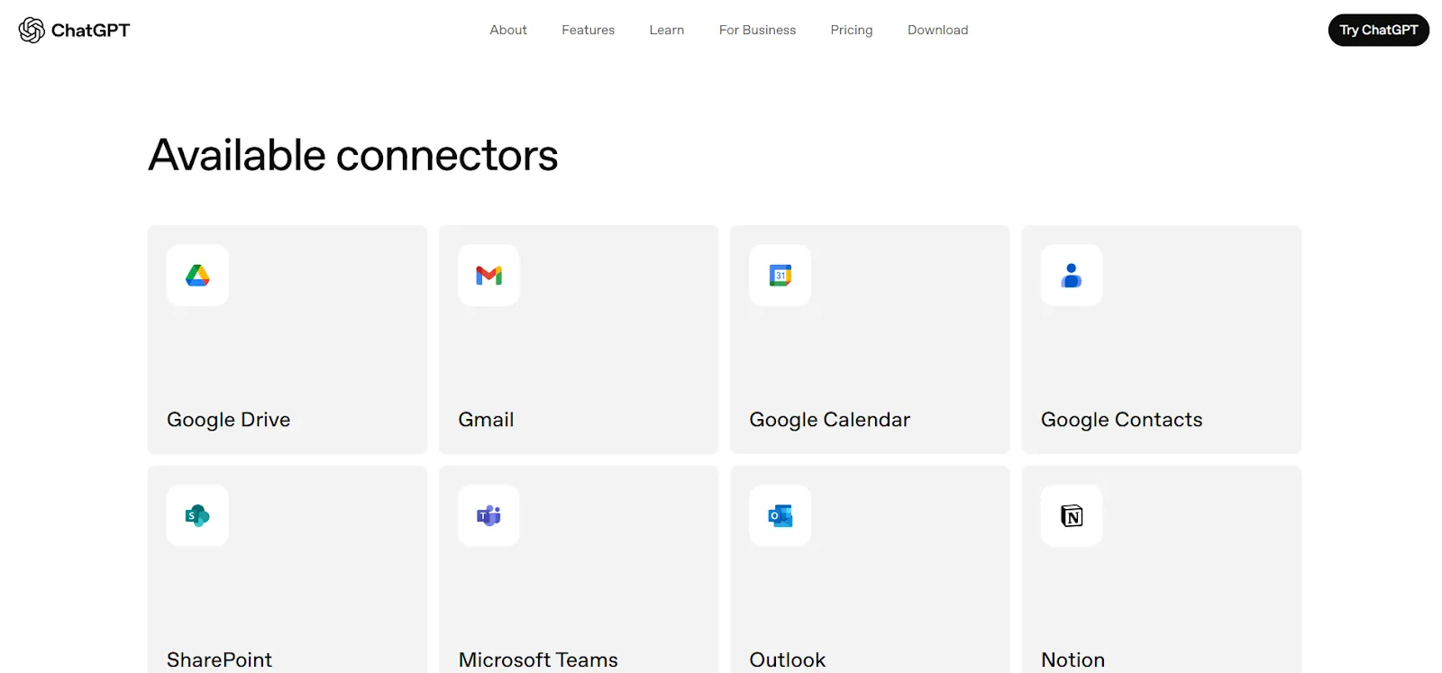 ChatGPT Teams connects directly with tools like Google Drive, Microsoft 365, and third-party apps through its integrations and API support.