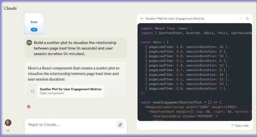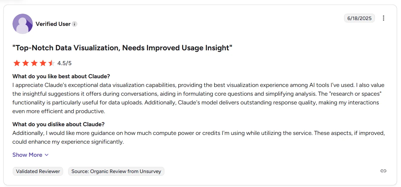 I appreciate Claude's exceptional data visualization capabilities, providing the best visualization experience among AI tools I've used. I also value the insightful suggestions it offers during conversations, aiding in formulating core questions and simplifying analysis. The "research or spaces" functionality is particularly useful for data uploads. - G2 Review