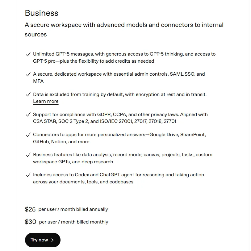 On this plan, teams get a shared workspace, admin controls, unified billing, and generous access to advanced models such as GPT-5.