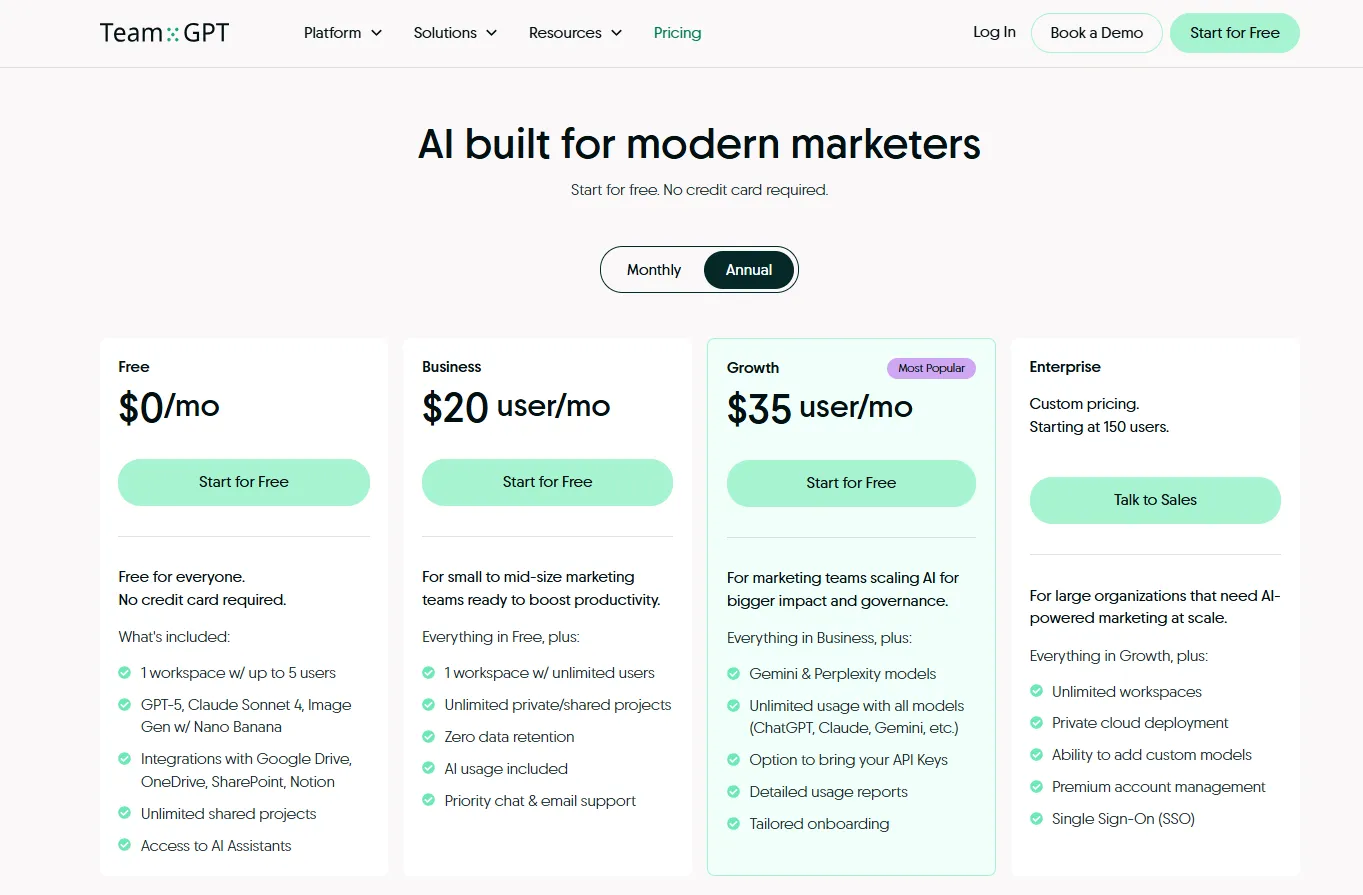 Team-GPT comes out on top for pricing thanks to its tiered plans - from Free Forever up to Enterprise - that make it accessible to small marketing teams while still scaling to global organizations.