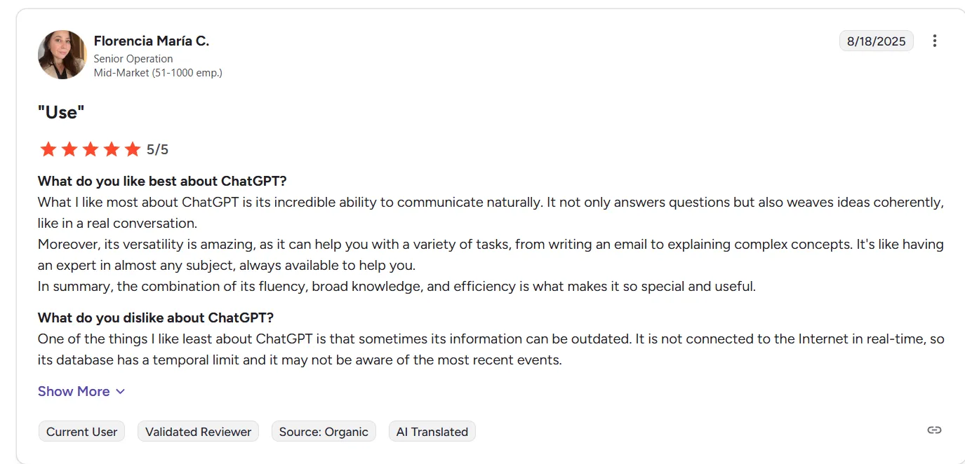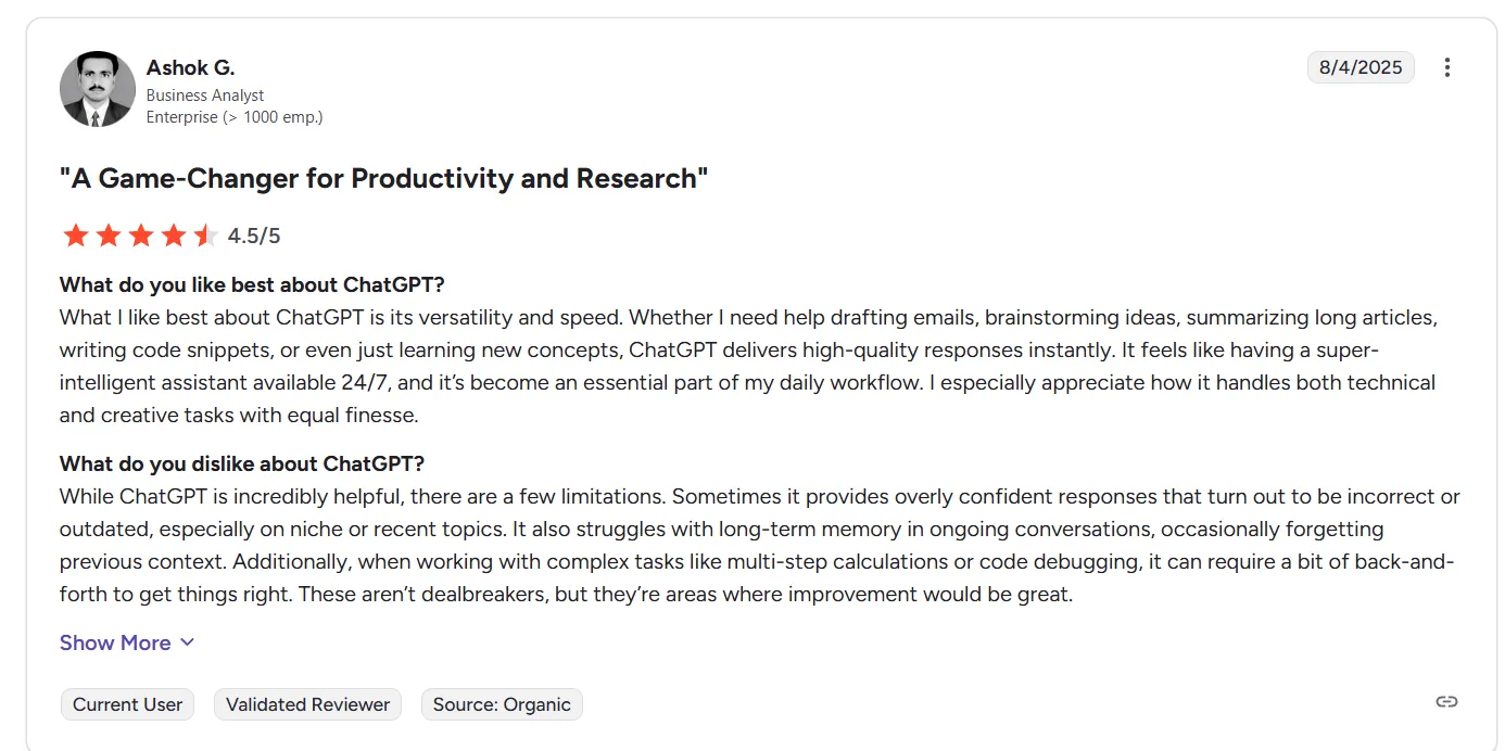 - Versatility across use cases: Reviewers highlight ChatGPT’s ability to handle everything from debugging code and generating boilerplate to drafting emails, creating blog posts, and breaking down complex topics into simple explanations.