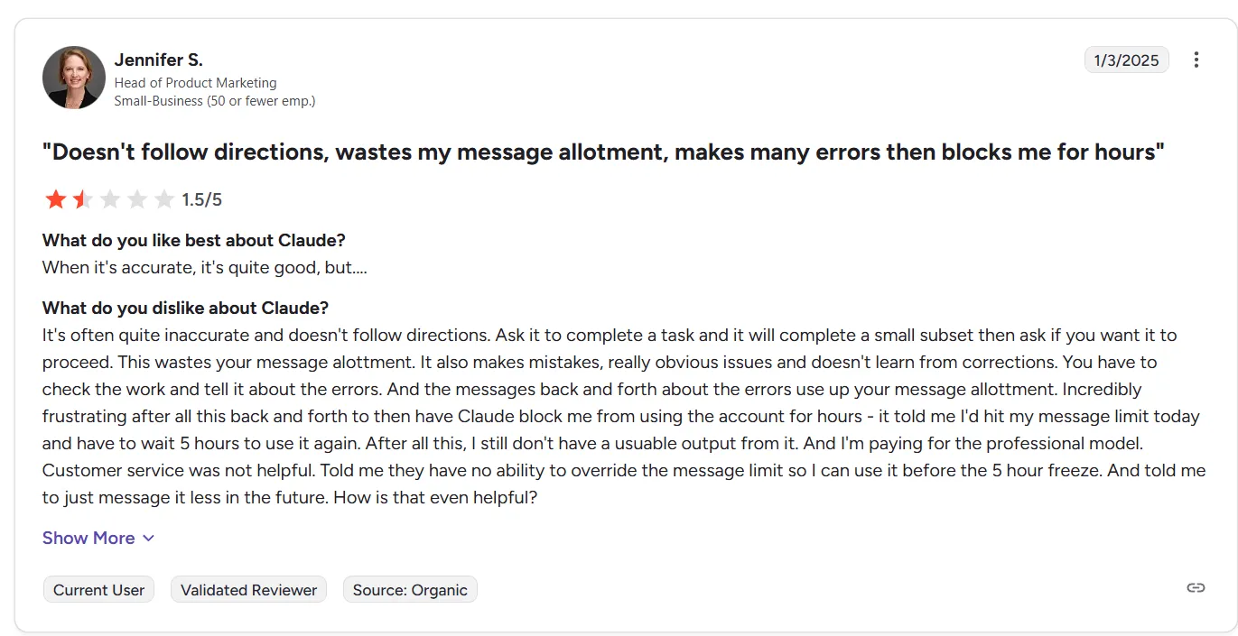 - Issues with following directions: A number of reviewers report Claude completing only part of a task, requiring extra prompts that eat into message limits.