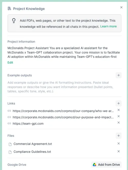 - Distinct project knowledge hubs: Create repositories of project-specific guidelines, instructions, and information that both AI and team members can easily access, maximizing productivity and efficiency and ensuring consistency across projects.