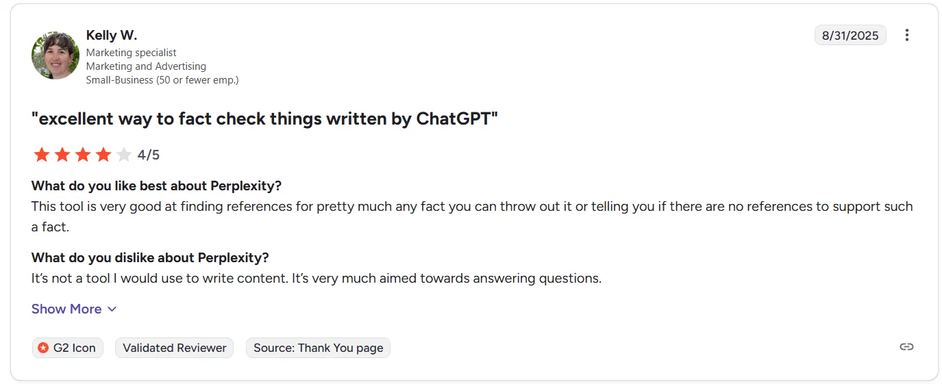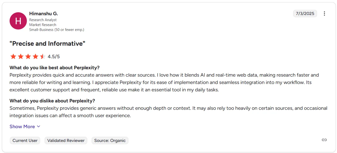 Perplexity provides quick and accurate answers with clear sources. I love how it blends AI and real-time web data, making research faster and more reliable for writing and learning. - G2 Review