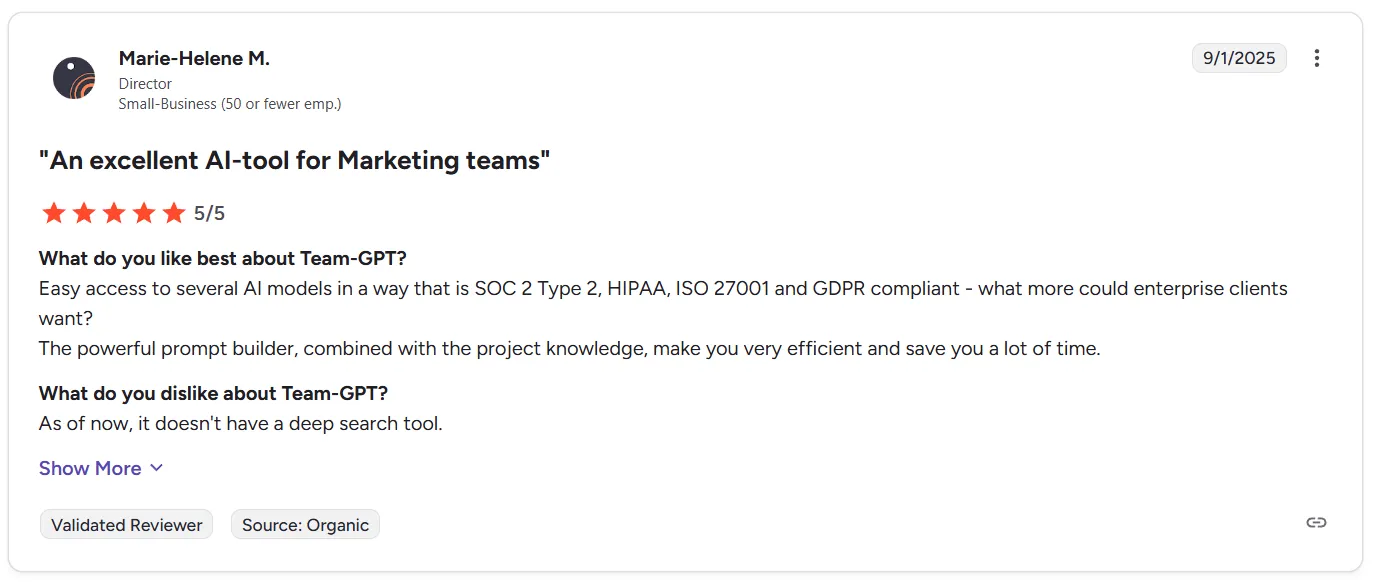 In this section, I’ll share real user feedback - straight from reviews and forums - to show how marketing teams, analysts, and administrators experience Team-GPT, ChatGPT Business, and Perplexity Enterprise Pro in practice.
