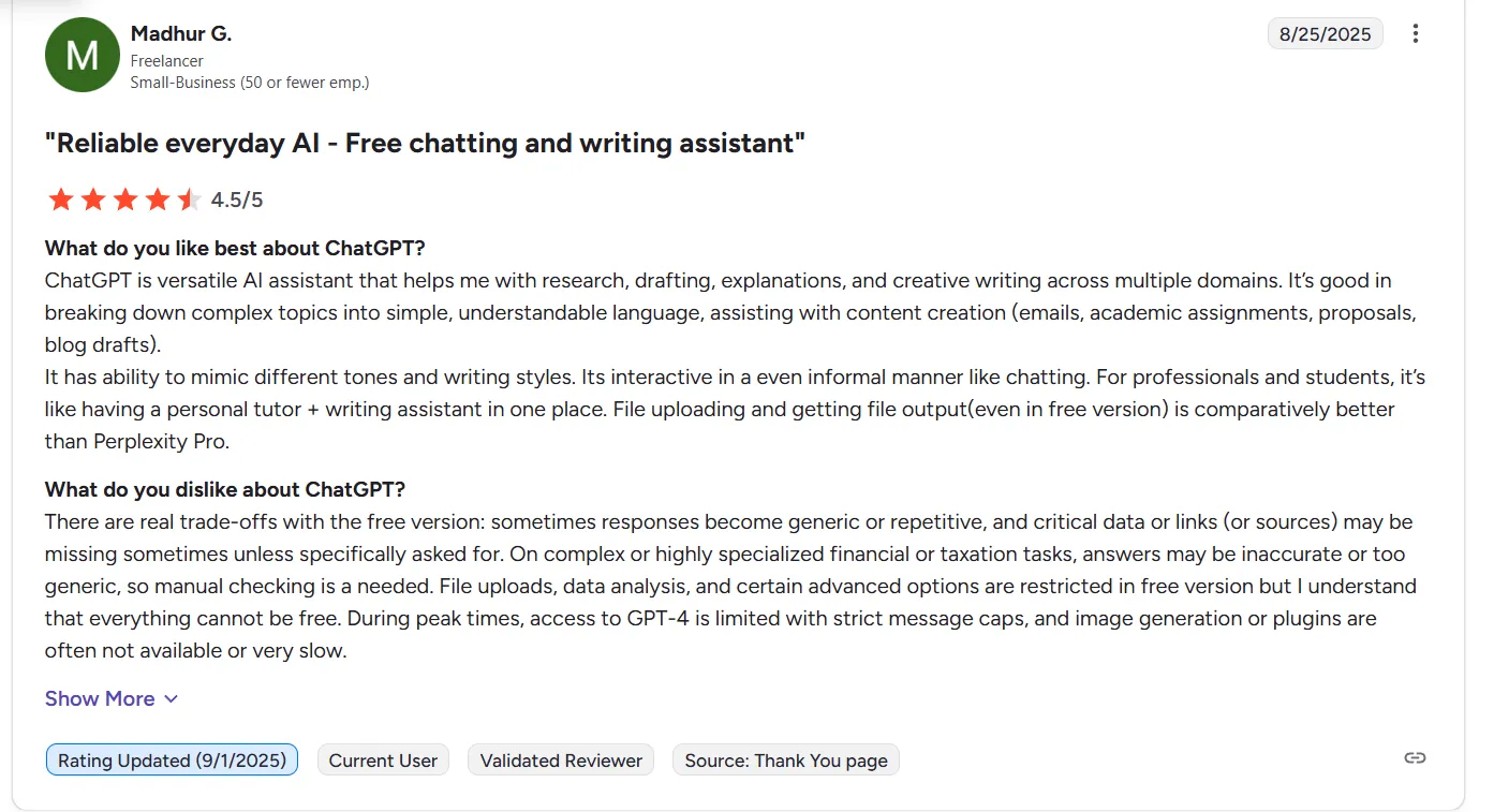 ChatGPT is a versatile AI assistant that helps me with research, drafting, explanations, and creative writing across multiple domains. It’s good at breaking down complex topics into simple, understandable language, assisting with content creation (emails, academic assignments, proposals, blog drafts). It has the ability to mimic different tones and writing styles. - G2 Review
