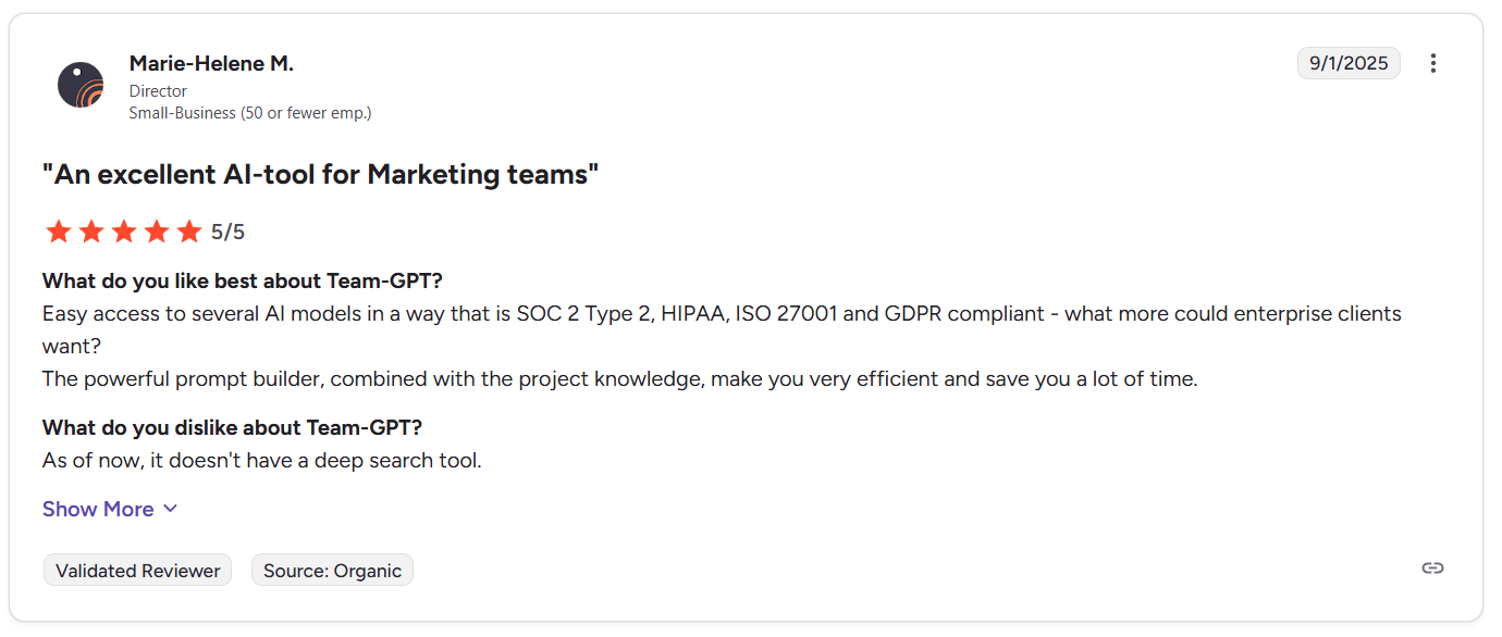 In this section, I’ll share real user feedback - straight from reviews and forums - to show how marketing teams, analysts, and administrators experience Juma (formerly Team-GPT), ChatGPT Business, and Perplexity Enterprise Pro in practice.