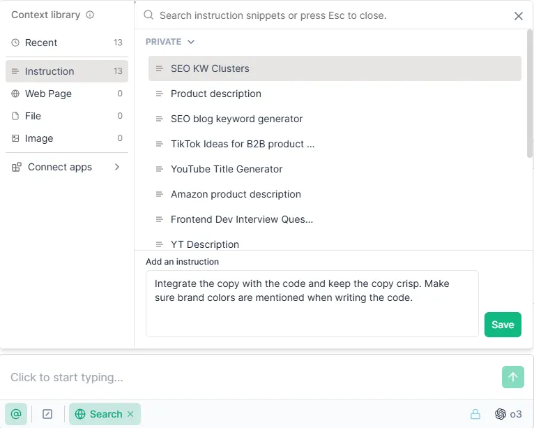 - Custom Prompt Libraries: Save commonly used prompts (e.g., email nurture sequences or A/B ad copy formats) and share them across teams.