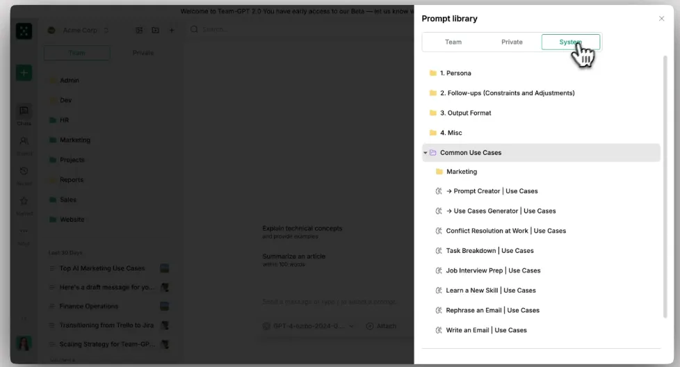 - Organized Collaboration: Users consistently highlight how Team-GPT’s interface makes it easy to organize projects. You can group conversations and prompts into folders and subfolders, which helps teams share knowledge efficiently and avoid duplicating work.