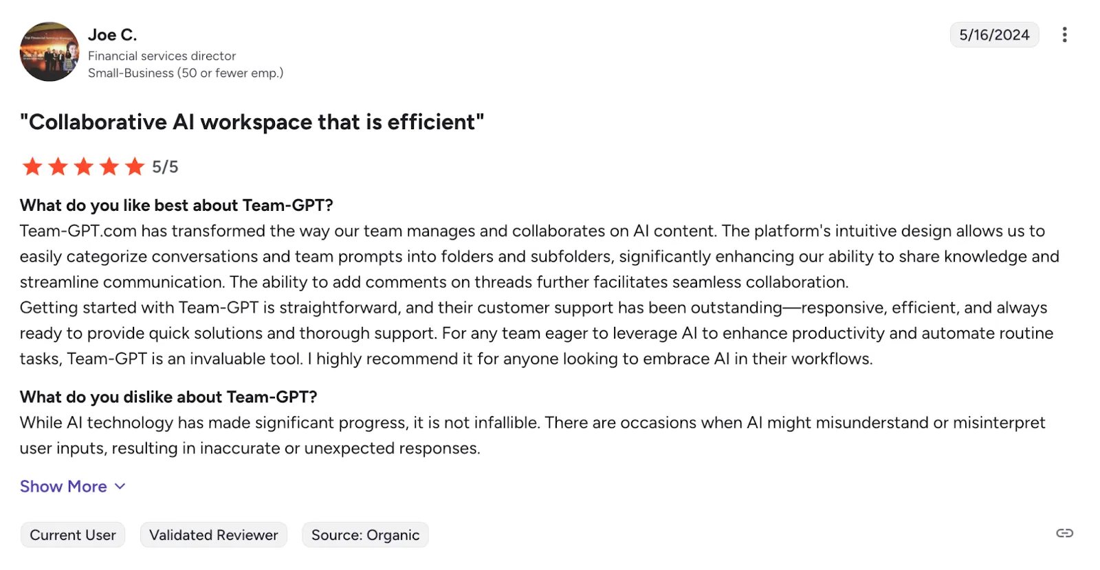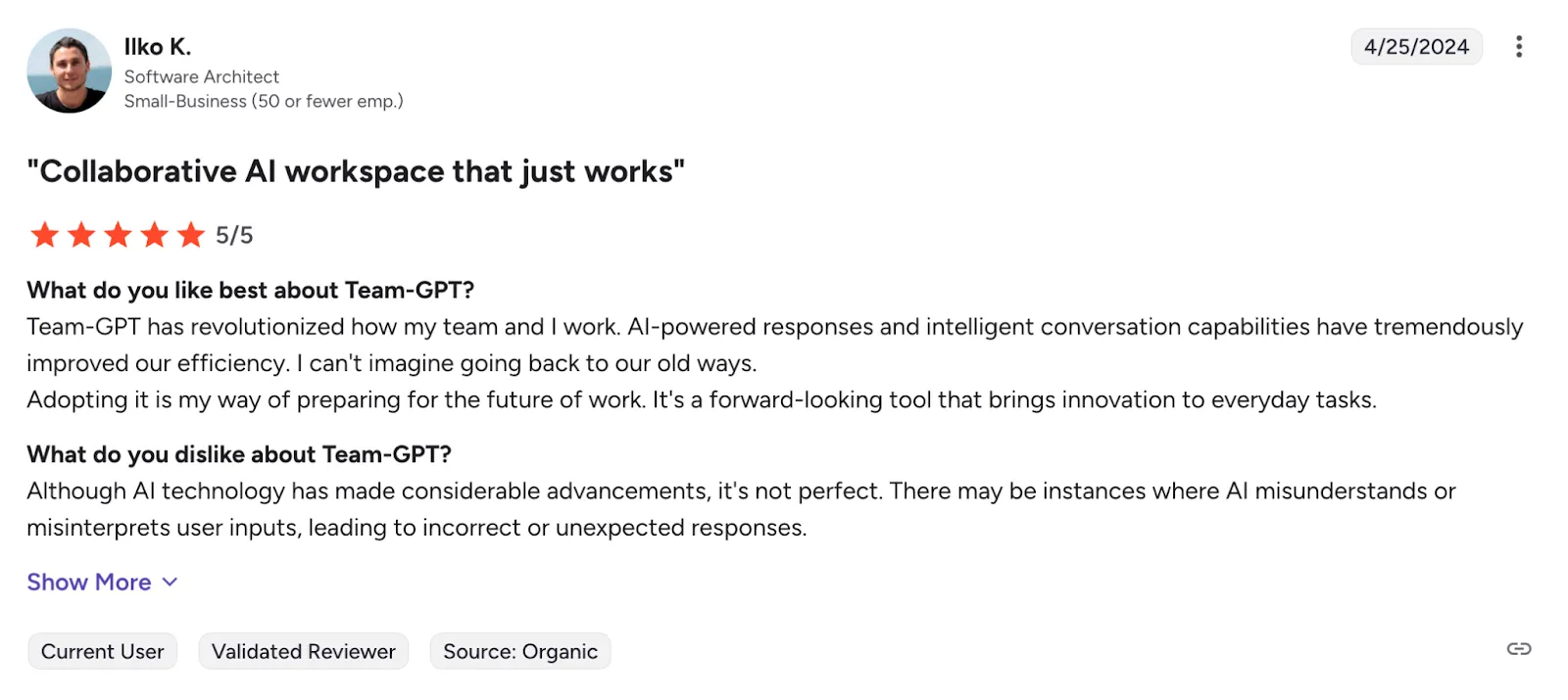 - Users love Team-GPT for how easy it makes team collaboration, especially with its folder-based organization and prompt-sharing features. While it improves daily workflows, users do point out minor AI response inconsistencies.