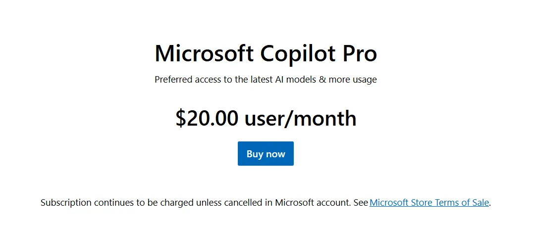 Copilot Pro is an add-on to Microsoft 365 that unlocks advanced AI features inside Office apps and Designer, and it comes at a fixed fee of $20/mo per user.
