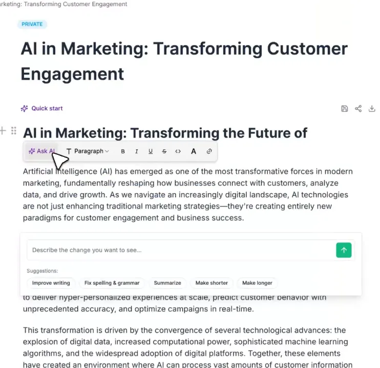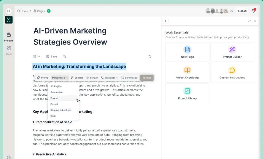 - AI-powered Pages: This is an AI-native editor that lets you create and edit campaign briefs, content strategies, blog posts, and other marketing docs, allowing you to structure them just like in Google Docs or Word. You can start with a simple prompt or a chat message, and the AI will generate a draft your team can refine together. When you want to edit, all it takes is highlighting any paragraph to rewrite, shorten, expand, paraphrase, or translate instantly, giving you fine control over tone and structure without breaking their flow.