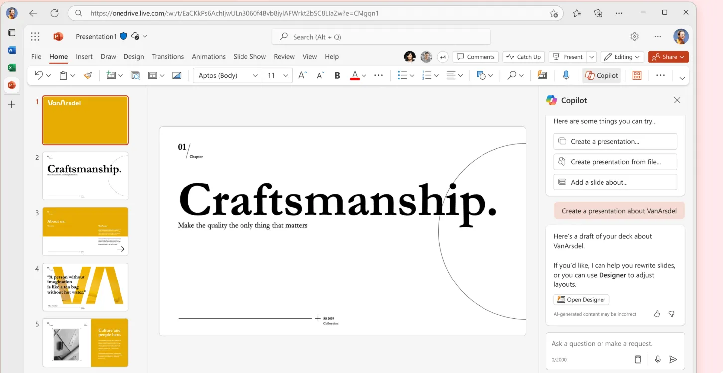 In PowerPoint, Copilot helps you create slide decks from scratch using prompts or existing files.