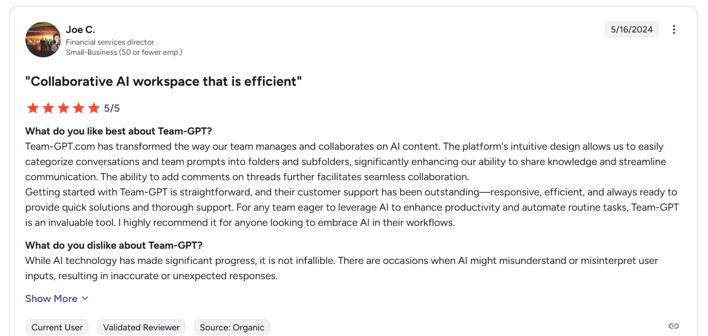 - Team-GPT earns high marks (4.8 on G2) for multi-model access, collaboration features, and ease of use, though some users note occasional AI errors and a less polished mobile app.