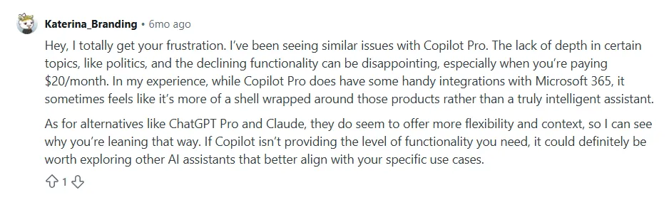 At $20 per month, I'm really starting to question the value I'm getting from Copilot Pro, especially as it seems to be becoming less capable over time. - Reddit post