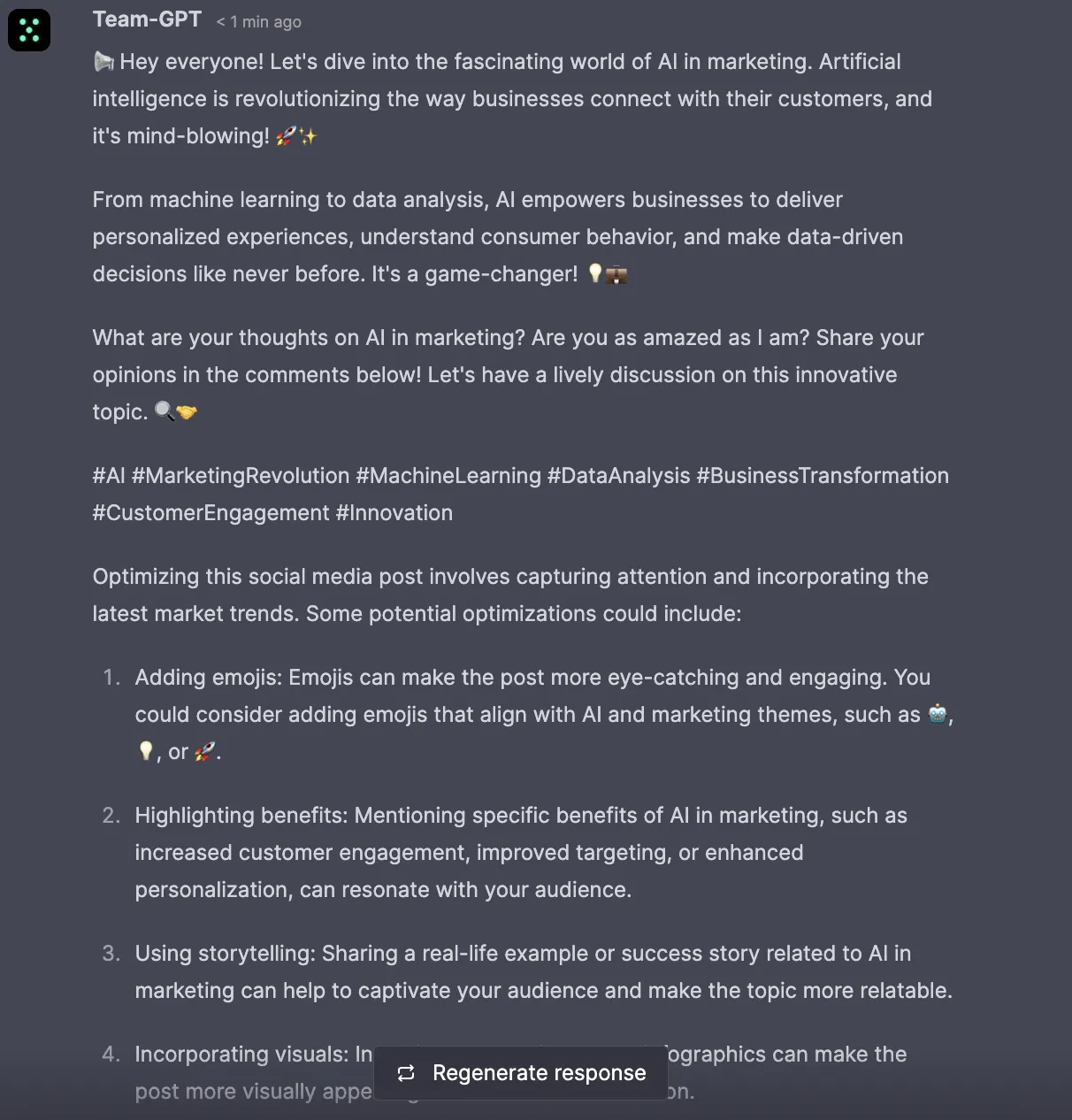 You can use ChatGPT with your marketing team on Team-GPT’s platform and customize it to your needs to generate marketing plans.