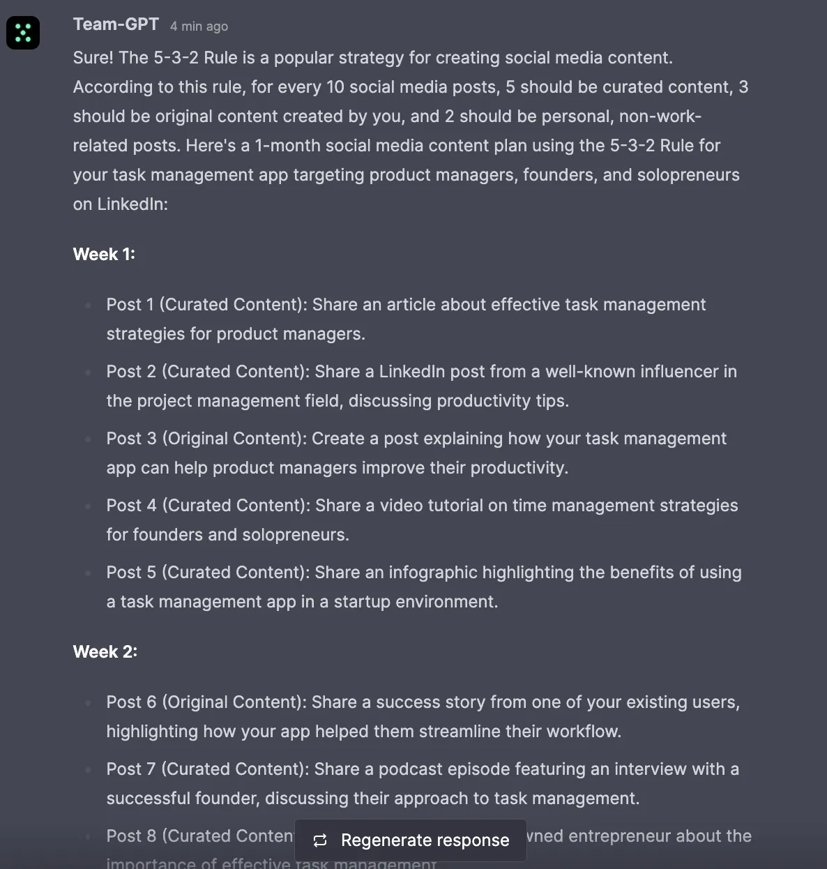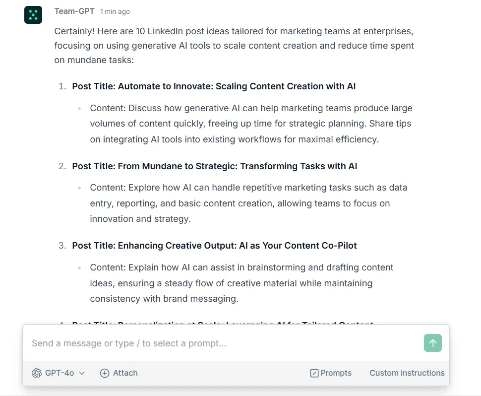 💡 Tools like Team-GPT let you further improve your content quality and humanize it by creating custom instructions for your preferred AI model (such as ChatGPT).