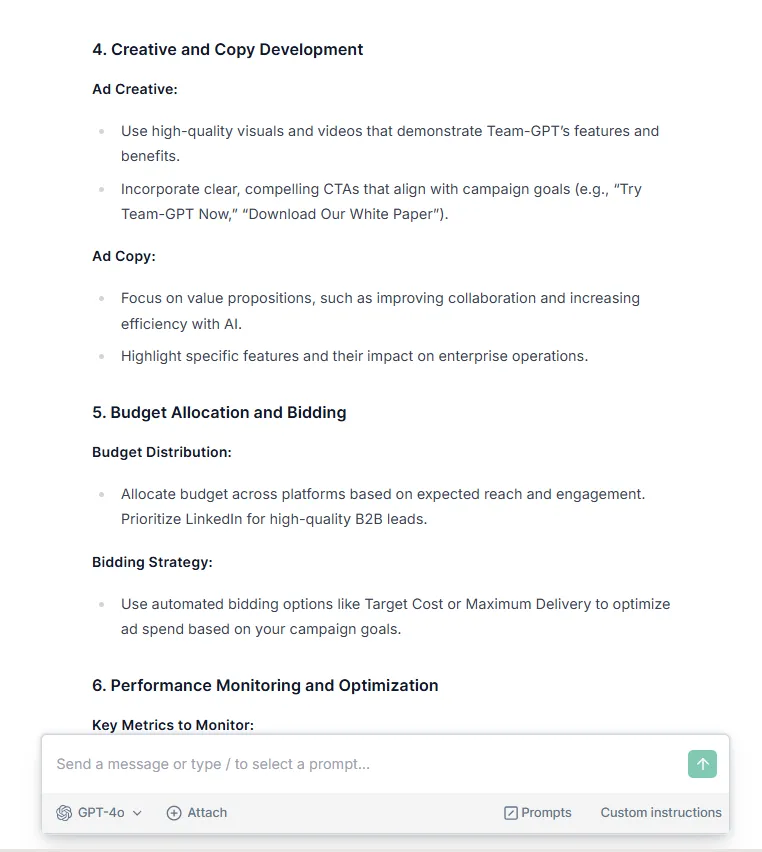 - Ad creative and copy development strategies, that include demonstrating Team-GPT’s features and benefits.