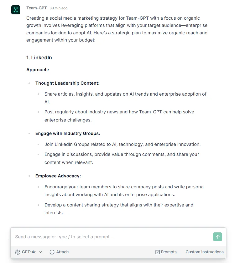 For this marketing strategy generation, I’ll be using Team-GPT (our tool) which lets you use different AI models alongside your team, such as ChatGPT, Perplexity, and Claude.