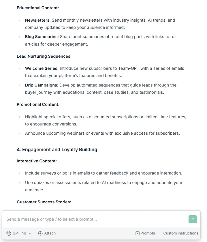 My custom version of ChatGPT on Team-GPT also generated a few additional tips, such as how to personalize the emails to our readers, how to incorporate visuals, and how to follow up after the email sequence.