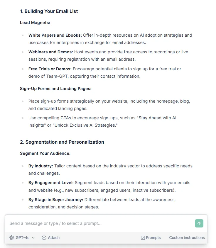 Prompt: Using the above-mentioned information on the marketing strategy for Team-GPT and our target audience and product, I want you to generate an email marketing strategy and dive deeper into how to nurture our leads with email and how to build a loyal email list.