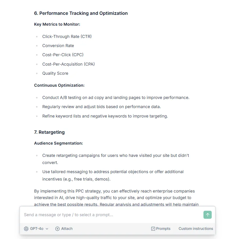 To evaluate the effectiveness of each platform, I’ll prompt each one of them with the same prompt for strategy creation that I used on my version of ChatGPT.