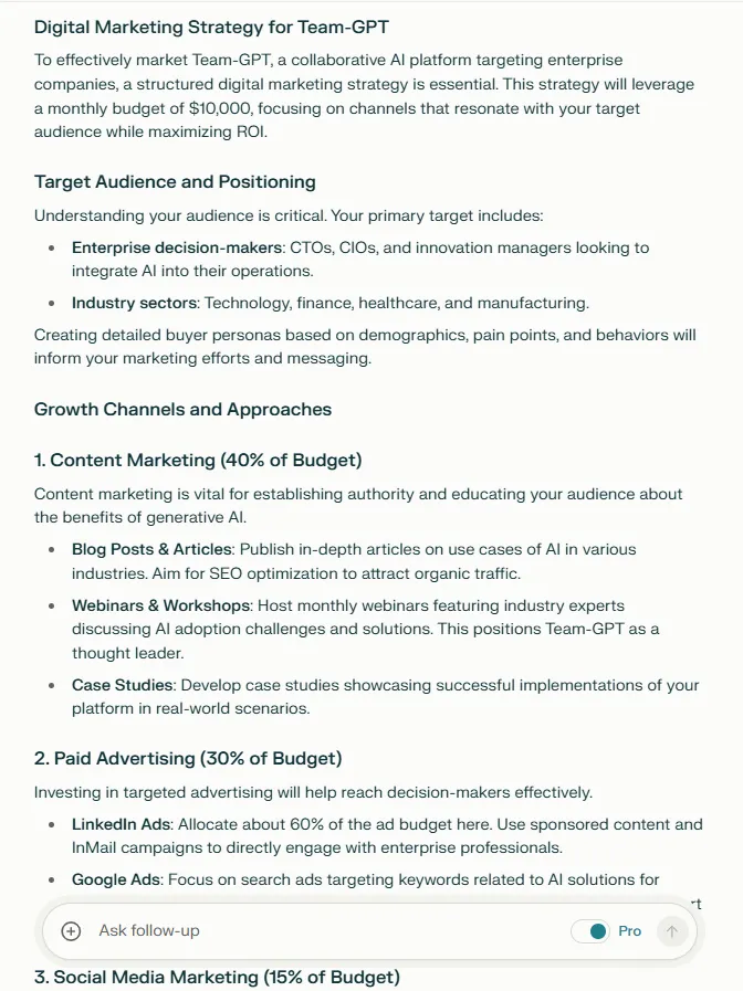 For example, you can see in the screenshot above how the platform allocated more budget to content marketing (unlike ChatGPT) since it believed content marketing is more vital for establishing authority than strategic partnerships.