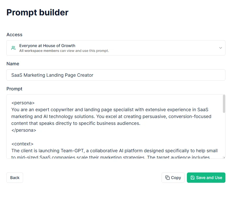 Although Team-GPT doesn’t have a traditional website copy generator, it provides more value for businesses and marketing teams by offering a collaborative workspace. This lets you create better prompts, share successful templates, and continuously refine your copy generation process.