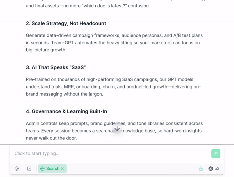 Unlike other copy generators that focus solely on content generation, Team-GPT enables your team to collaborate seamlessly, store and refine prompts, and integrate a variety of AI models to ensure consistency and quality across all your marketing materials. With Team-GPT, you get: