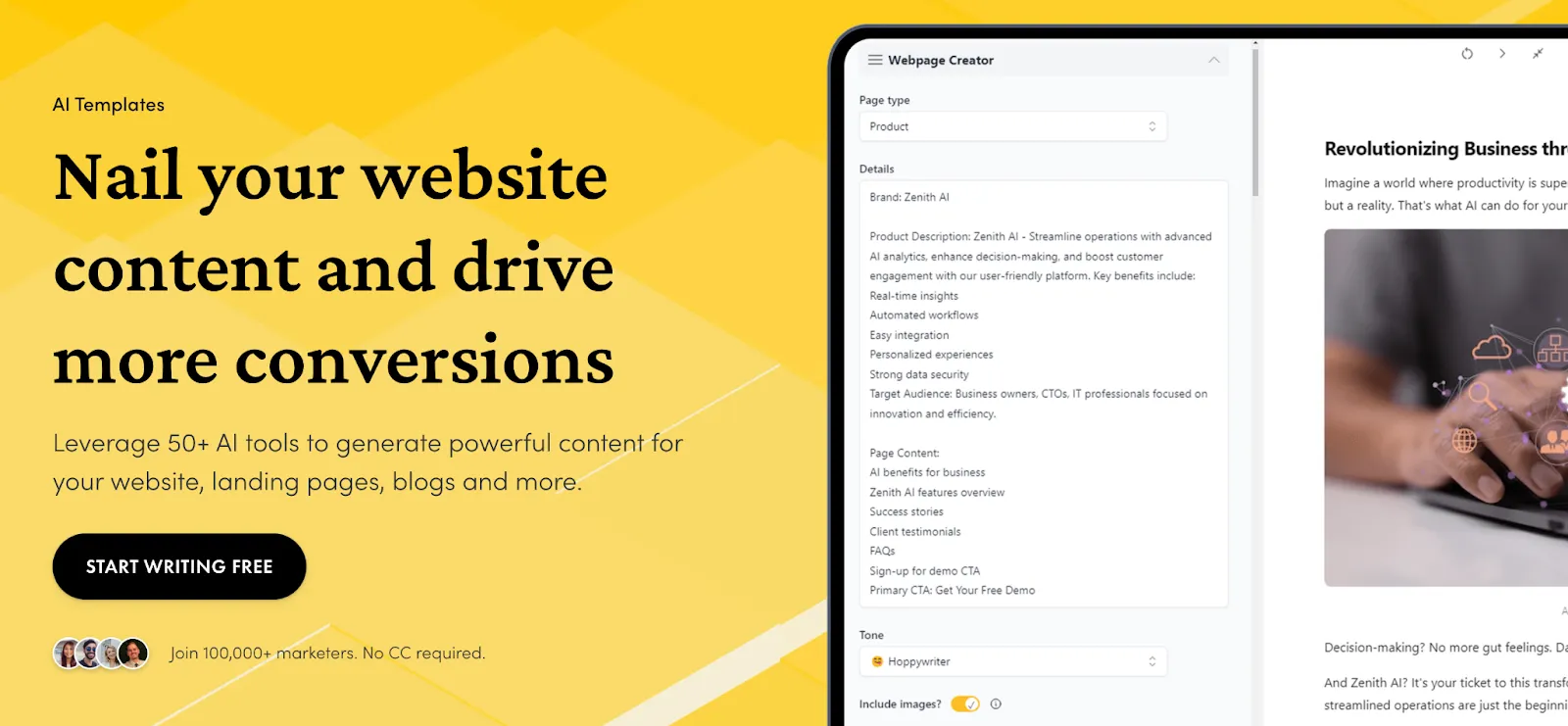 Best for: E-commerce businesses, digital marketers, small business owners, and startups looking to enhance website performance with high-converting copy.