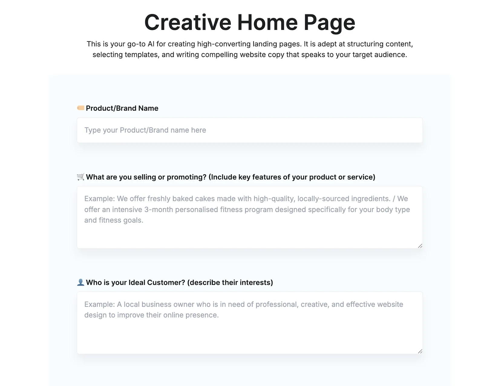 - Enter Your Page Details: I provide the necessary details about the product or service, the target audience, and the main objective of the content.