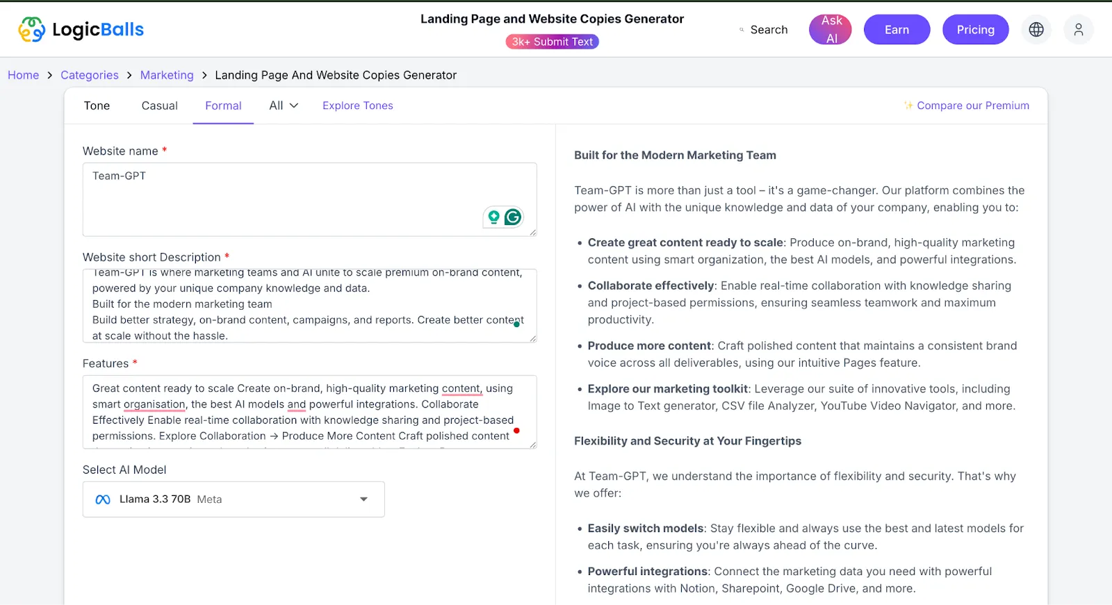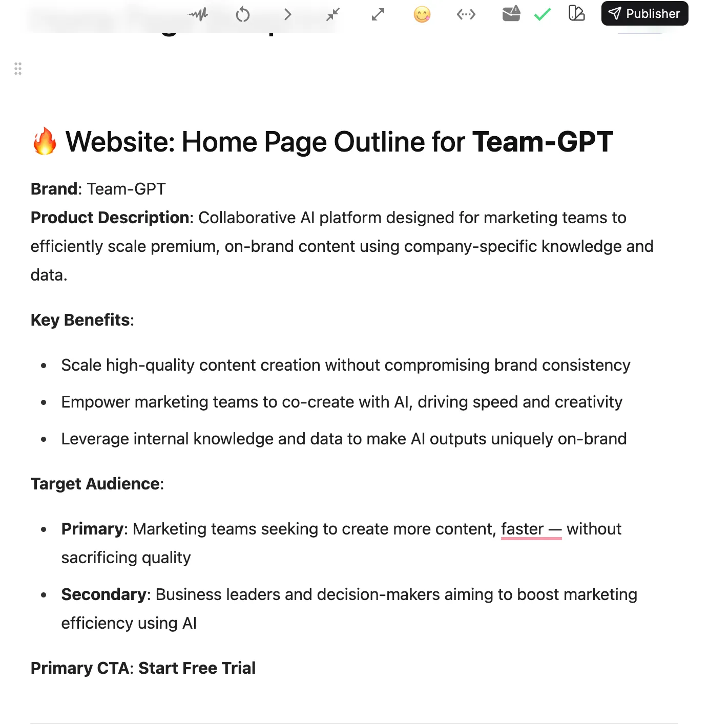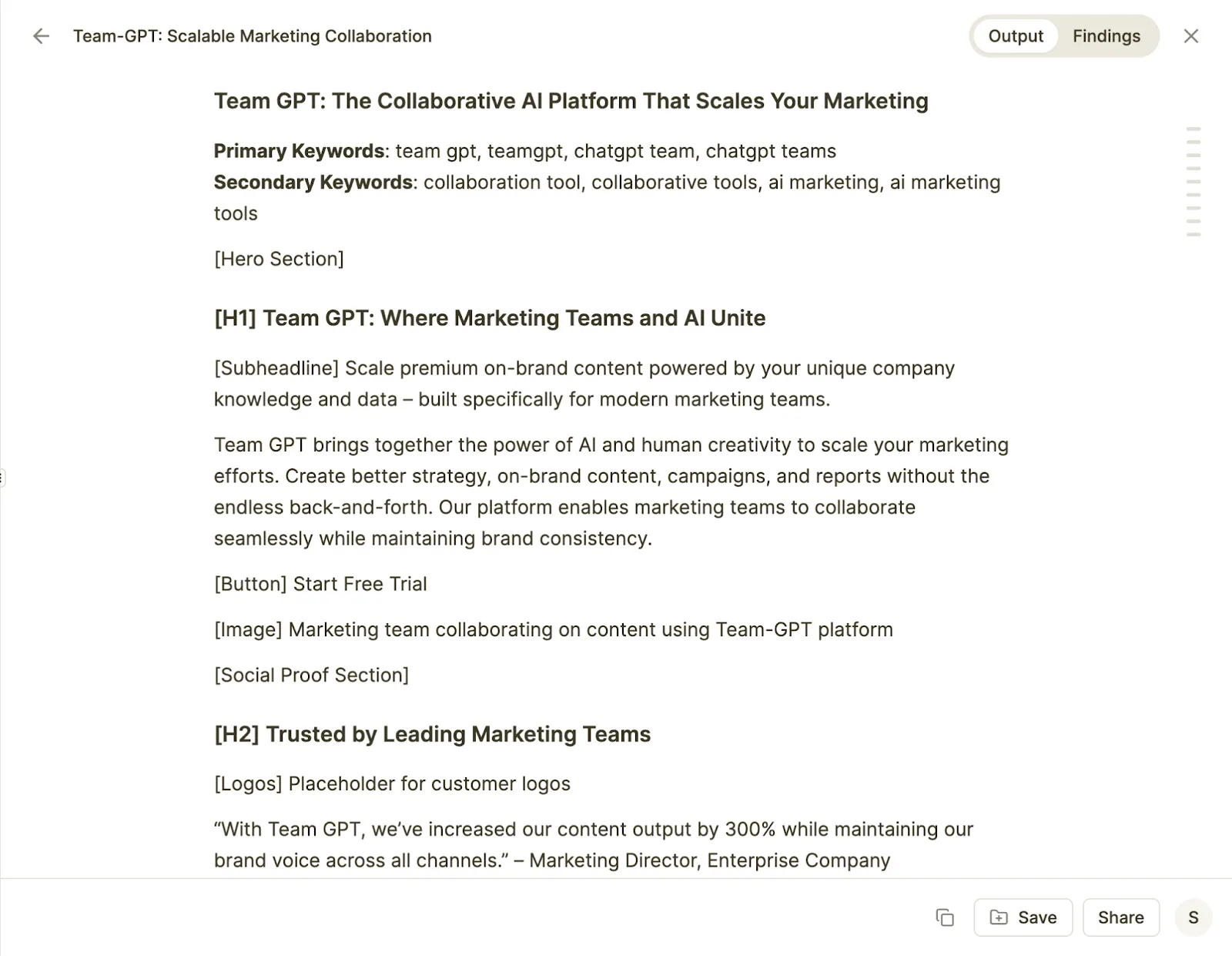 To test the tool, I used it to create a website copy for Team-GPT. Here’s the output: