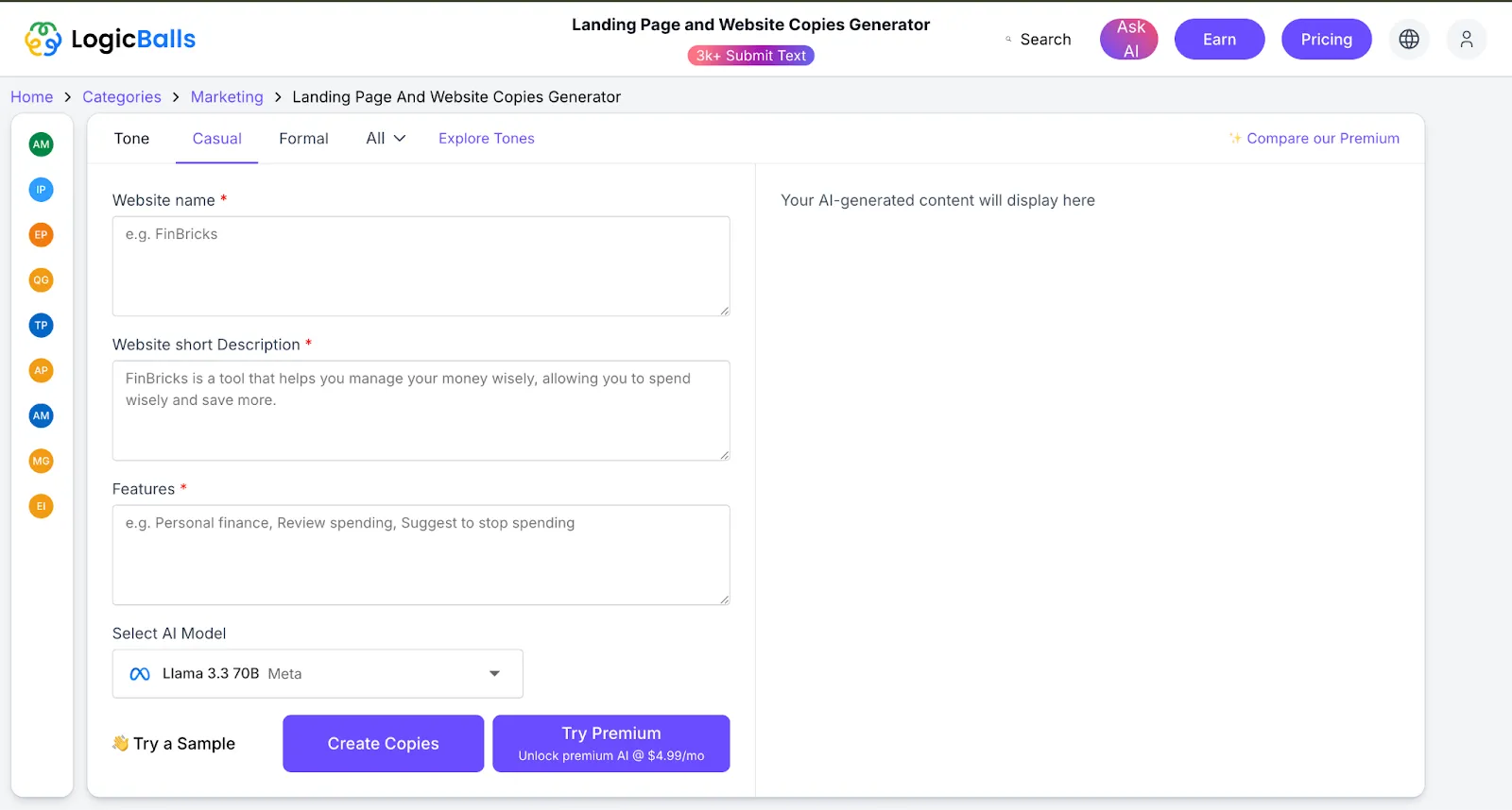 LogicBall’s landing page and website copy generator is one of the best website copy generation tools in 2025. It uses advanced AI to generate high-converting copy tailored to your business needs. The tool helps businesses quickly produce website copy that drives engagement and boosts conversion rates.