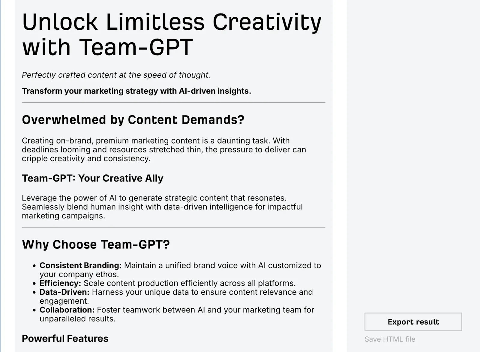 I tested the tool by asking it to generate a website copy for Team-GPT, and here’s what it came up with: