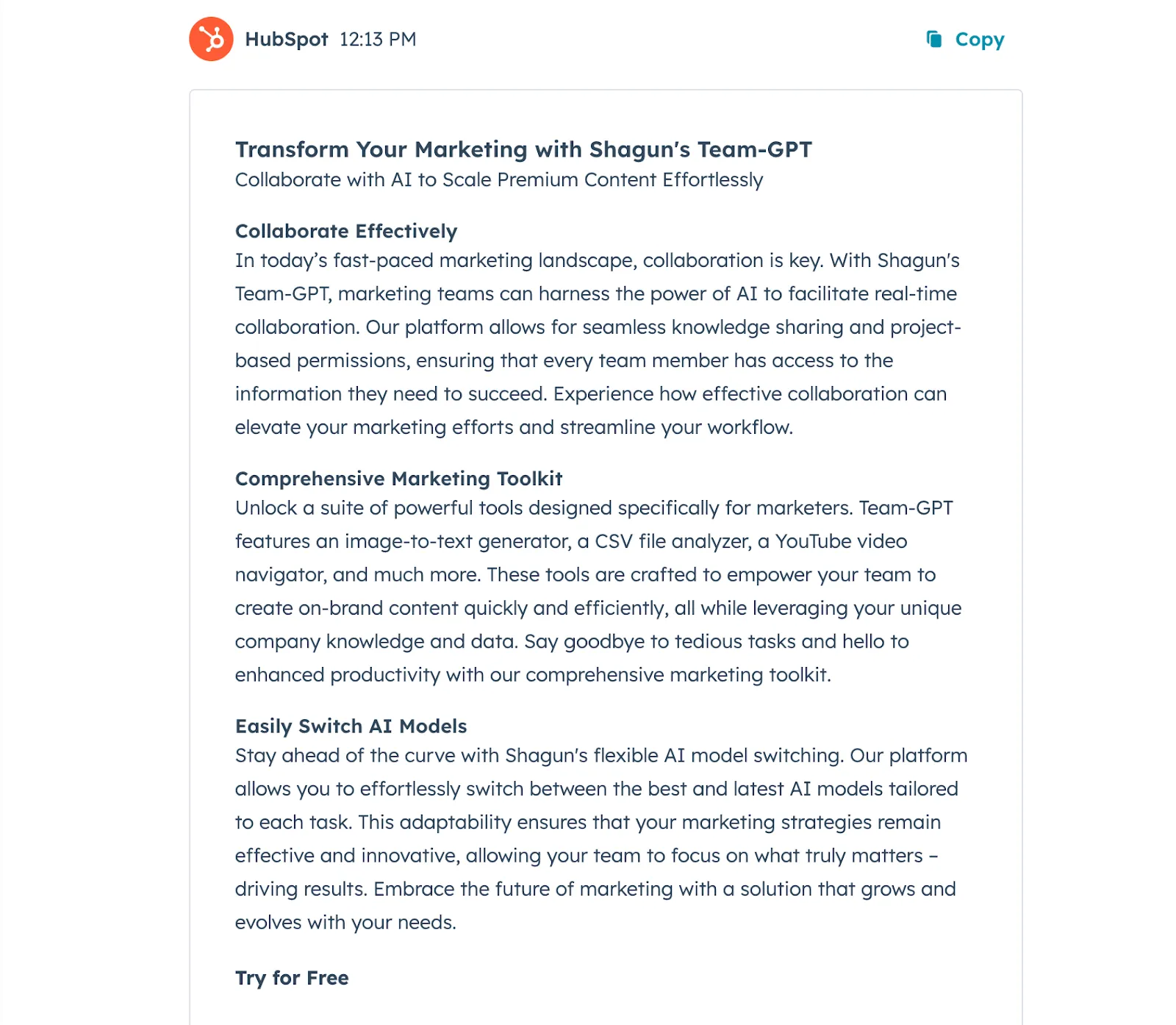 To test the tool, I asked Hoppy Copy to generate a website copy for Team-GPT. Here’s what it gave me: