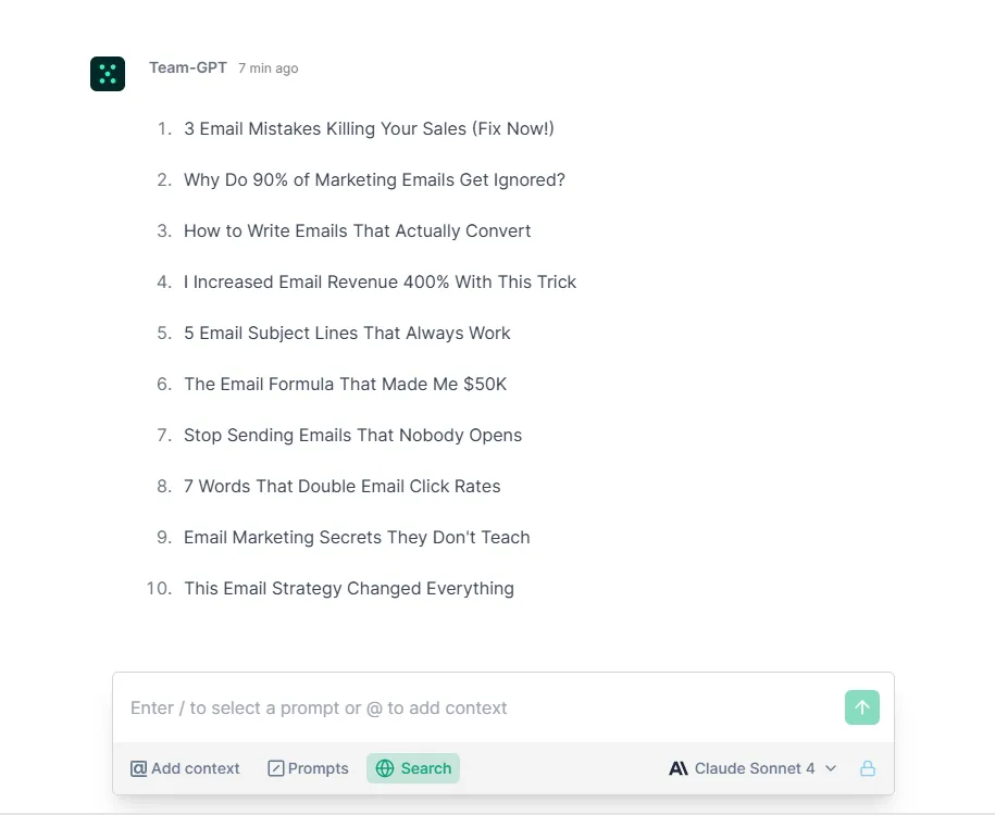 For this task, I will go with Claude, and here are some of the titles that Team-GPT generated: