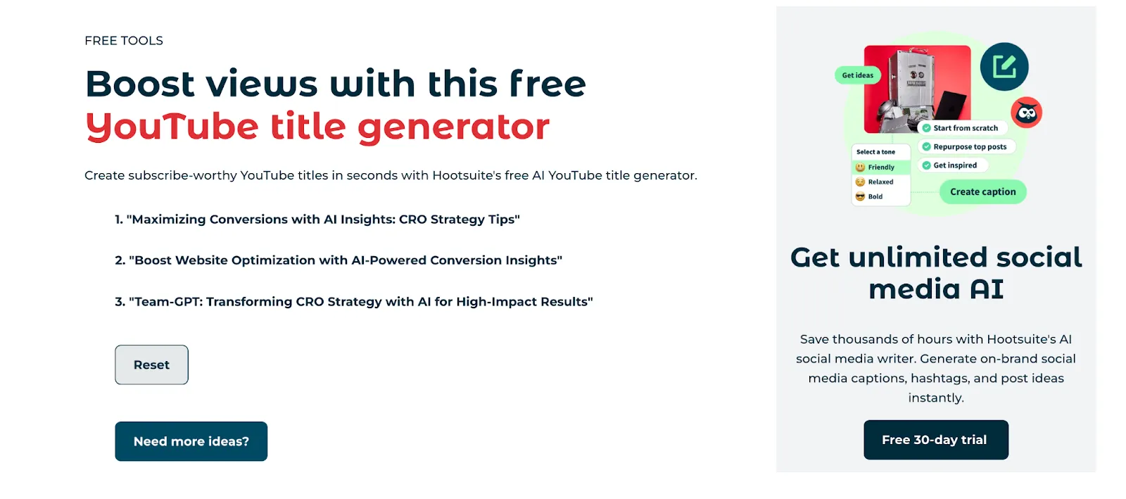 To test how Hootsuite works, I gave it a Team-GPT video topic, how to improve website conversions with AI, and these were the title suggestions.