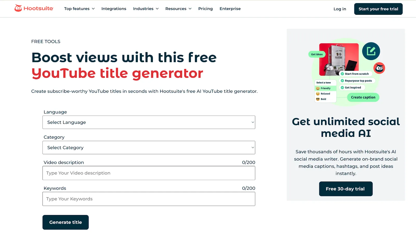 Hootsuite’s YouTube title generator helps you write optimized, clickable titles based on your video’s content, category, and keywords. It’s powered by ChatGPT and tuned using real inputs from social media experts, so the titles follow YouTube’s recommended practices.