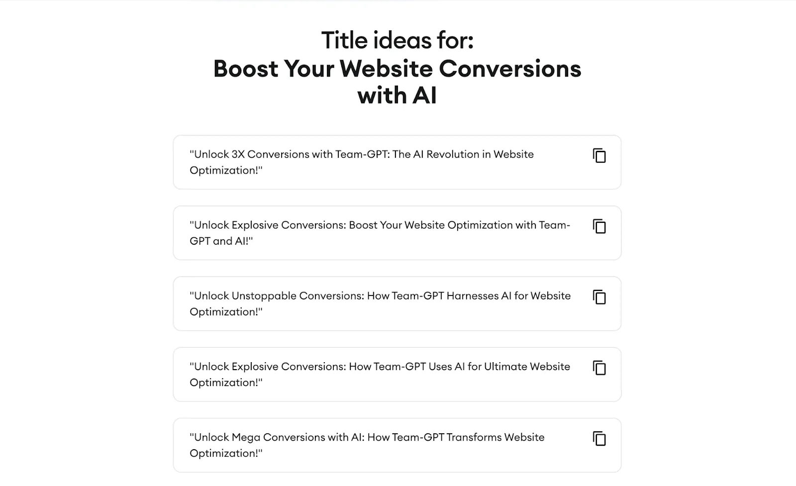 I ran a quick test on TunePocket’s title generator using Team-GPT’s video topic on AI and website conversions. These were the results.