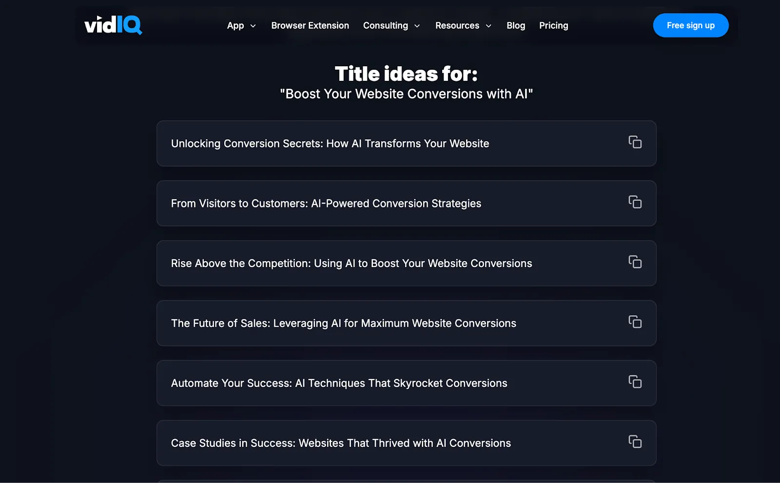 VidIQ is one of the most advanced YouTube title generators in 2025. It goes beyond basic AI tools by combining artificial intelligence with view prediction algorithms and YouTube best practices. You get five title suggestions at a time, each optimized to boost clicks and engagement.